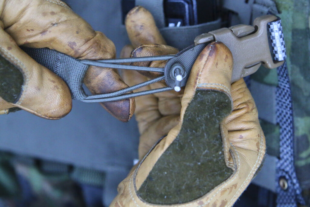 Keskellä oleva iso velcro-pinta antaa hyvin kattavan muokattavuuden. Samainen velcro mahdollistaa myös erilaisten viestintävälineiden kaapeloinnin mukavasti. Johdot kun saa piiloon velcron pohjan ja paneeliin väliin. Chesty Rig Wide V2:ssa on pari hyvää oivallustakin, jotka ansaitsevat tulla mainituiksi. Valjaiden niin sanotussa vyölenkissä on pieni elastinen kuminyörin pätkä, jonka ansiosta valjaat saa tiukalle, mutta nyöri antaa juuri sopivan määrän joustoa ja eloa erilaisiin tilanteisiin. Lisäksi velcro-kujaston reunoilla on erilliset läpiviennit, joiden avulla esimerkiksi radiotaskut voi kiinnittää siten, että radio kulkee kylkikujastojen sisäpuolella vaatimatta erillistä tilaa kujastoista. Tämä on todella toimiva ratkaisu, jonka ansiosta isokin radio kulkee mukavasti erillisessä wing-tyyppisessä taskussa jättäen vielä tilaa isoille yleistaskuille.